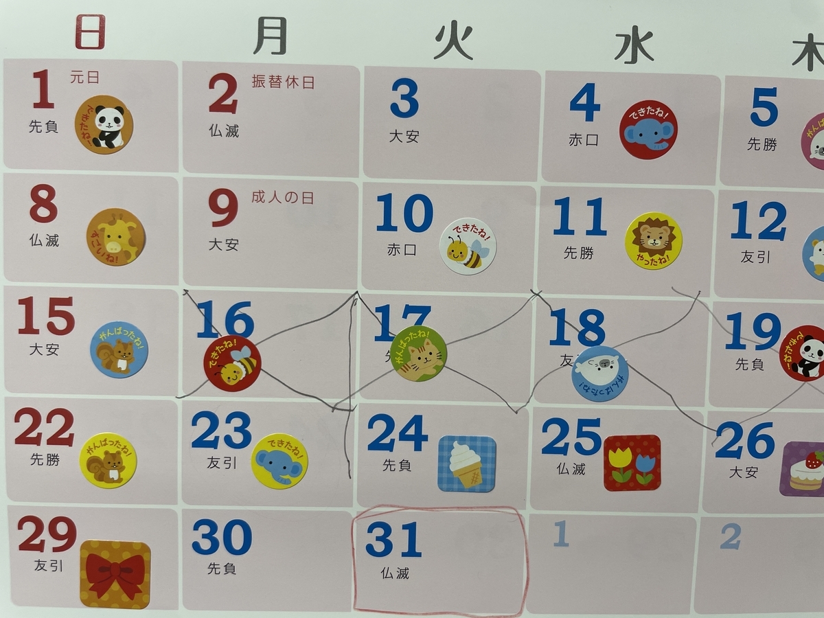今日一日もまた生き延びた、とご褒美にカレンダーにシール貼る。